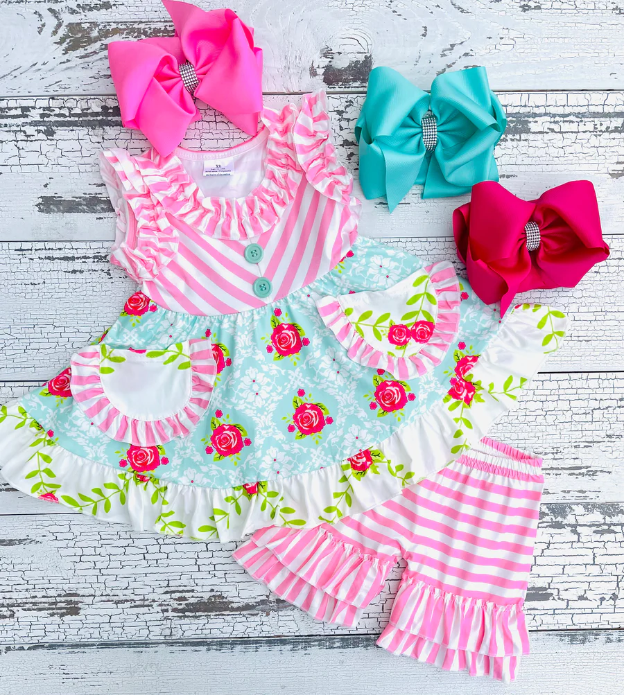 Aqua & Pink Stripe Floral Tunic Shorts Outfit baby clothes