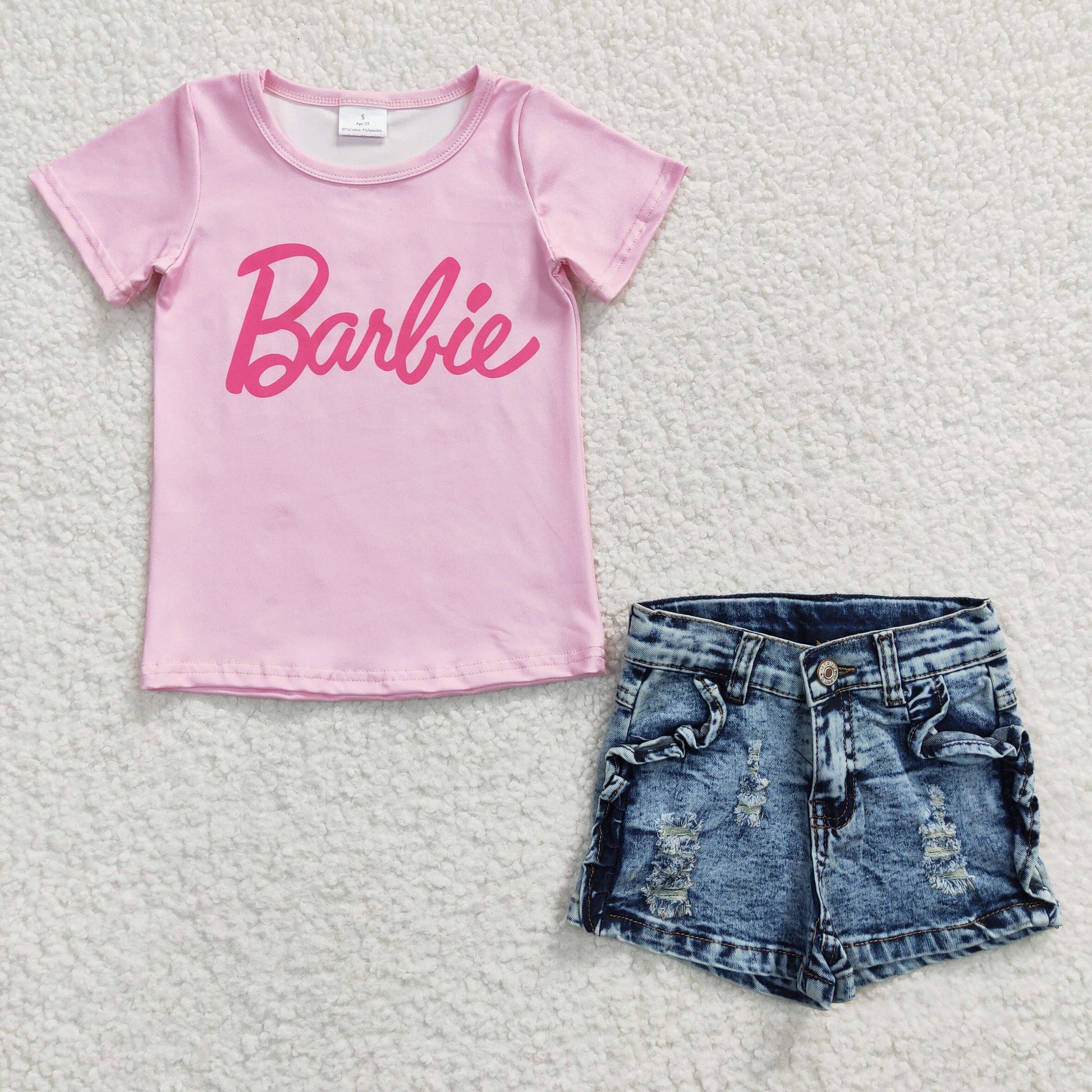 short sleeve girls doll top distressed denim shorts 2pcs set